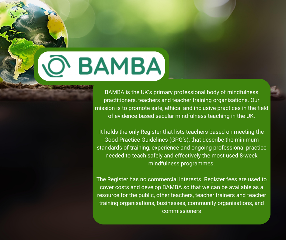 BAMBA is the UK’s primary professional body of mindfulness practitioners, teachers and teacher training organisations. Our mission is to promote safe, ethical and inclusive practices in the field of evidence-based secular mindfulness teaching in the UK.