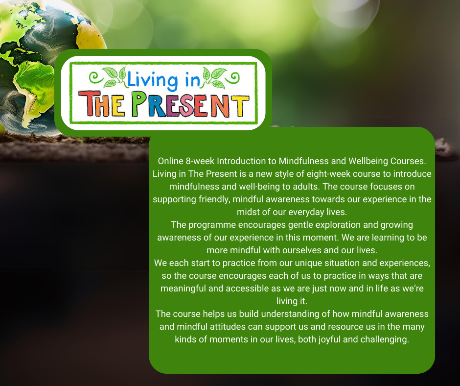 Living in The Present is a new style of eight-week course to introduce mindfulness and well-being to adults. The course focuses on supporting friendly, mindful awareness towards our experience in the midst of our everyday lives. The programme encourages gentle exploration and growing awareness of our experience in this moment. We are learning to be more mindful with ourselves and our lives. We each start to practice from our unique situations and experiences, so the course encourages each of us to practice in ways that are meaningful and accessible as we are just now and in life as we’re living it.