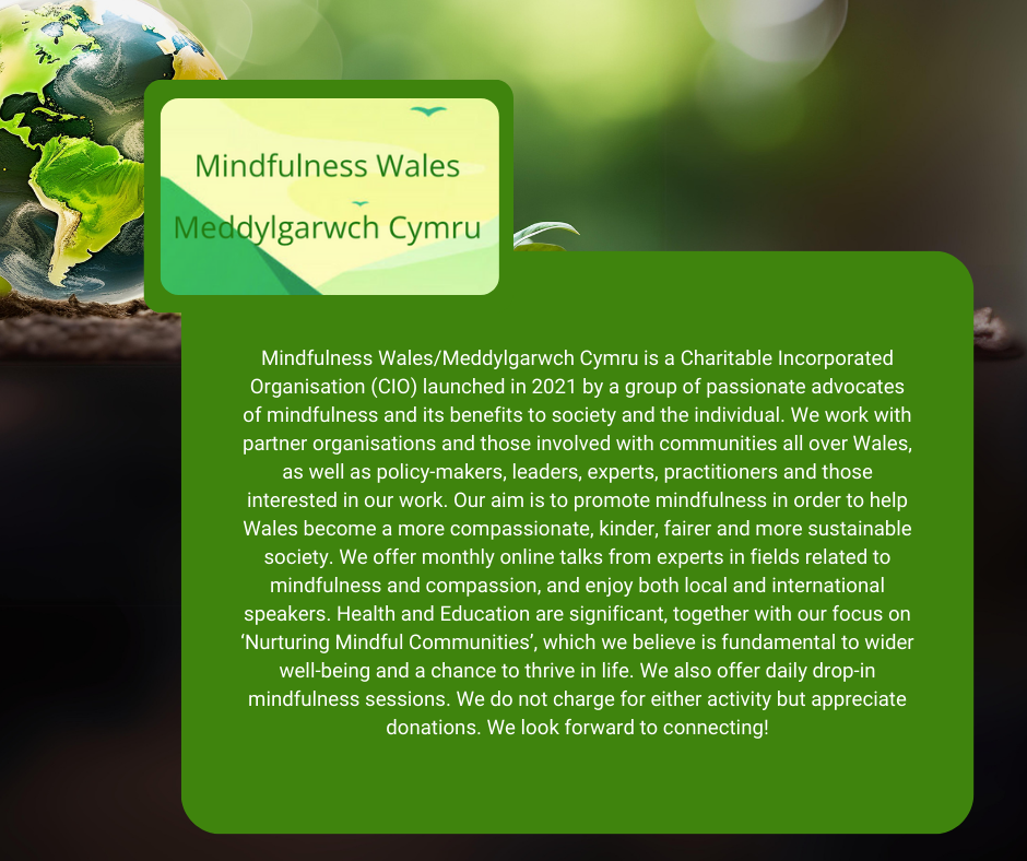 Mindfulness Wales/Meddylgarwch Cymru is a Charitable Incorporated Organisation (CIO) launched in 2021 by a group of passionate advocates of mindfulness and its benefits to society and the individual. We work with partner organisations and those involved with communities all over Wales, as well as policy-makers, leaders, experts, practitioners and those interested in our work. Our aim is to promote mindfulness in order to help Wales become a more compassionate, kinder, fairer and more sustainable society. We offer monthly online talks from experts in fields related to mindfulness and compassion, and enjoy both local and international speakers. Health and Education are significant, together with our focus on ‘Nurturing Mindful Communities’, which we believe is fundamental to wider well-being and a chance to thrive in life. We also offer daily drop-in mindfulness sessions. We do not charge for either activity but appreciate donations. We look forward to connecting!