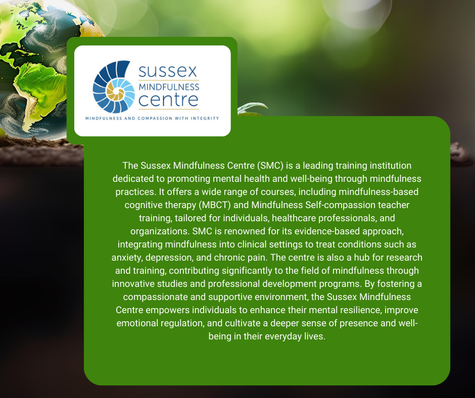 The Sussex Mindfulness Centre (SMC) is a leading training institution dedicated to promoting mental health and well-being through mindfulness practices. It offers a wide range of courses, including mindfulness-based cognitive therapy (MBCT) and Mindfulness Self-compassion teacher training, tailored for individuals, healthcare professionals, and organizations. SMC is renowned for its evidence-based approach, integrating mindfulness into clinical settings to treat conditions such as anxiety, depression, and chronic pain. The centre is also a hub for research and training, contributing significantly to the field of mindfulness through innovative studies and professional development programs. By fostering a compassionate and supportive environment, the Sussex Mindfulness Centre empowers individuals to enhance their mental resilience, improve emotional regulation, and cultivate a deeper sense of presence and well-being in their everyday lives.