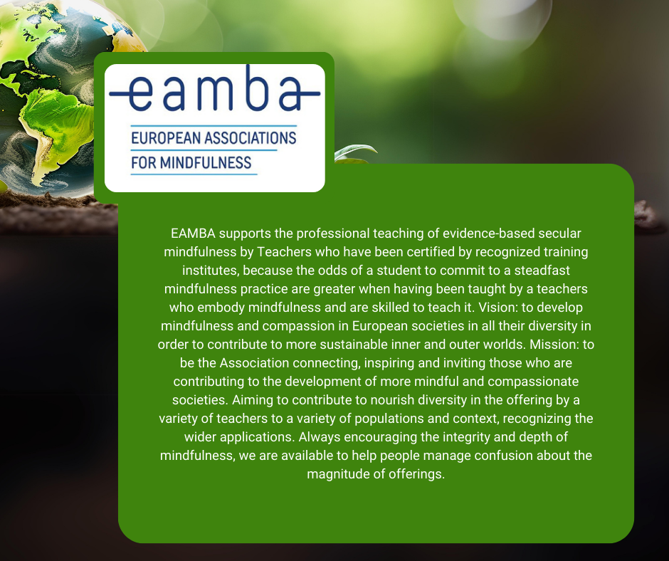 EAMBA supports the professional teaching of evidence-based secular mindfulness by Teachers who have been certified by recognized training institutes, because the odds of a student to commit to a steadfast mindfulness practice are greater when having been taught by a teachers who embody mindfulness and are skilled to teach it. Vision: to develop mindfulness and compassion in European societies in all their diversity in order to contribute to more sustainable inner and outer worlds. Mission: to be the Association connecting, inspiring and inviting those who are contributing to the development of more mindful and compassionate societies. Aiming to contribute to nourish diversity in the offering by a variety of teachers to a variety of populations and context, recognizing the wider applications. Always encouraging the integrity and depth of mindfulness, we are available to help people manage confusion about the magnitude of offerings.