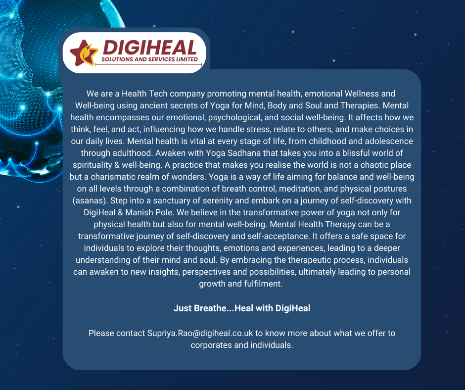 We are a Health Tech company promoting mental health, emotional Wellness and Well-being using ancient secrets of Yoga for Mind, Body and Soul and Therapies. Mental health encompasses our emotional, psychological, and social well-being. It affects how we think, feel, and act, influencing how we handle stress, relate to others, and make choices in our daily lives. Mental health is vital at every stage of life, from childhood and adolescence through adulthood. Awaken with Yoga Sadhana that takes you into a blissful world of spirituality & well-being. A practice that makes you realise the world is not a chaotic place but a charismatic realm of wonders. Yoga is a way of life aiming for balance and well-being on all levels through a combination of breath control, meditation, and physical postures (asanas). Step into a sanctuary of serenity and embark on a journey of self-discovery with DigiHeal & Manish Pole. We believe in the transformative power of yoga not only for physical health but also for mental well-being. Mental Health Therapy can be a transformative journey of self-discovery and self-acceptance. It offers a safe space for individuals to explore their thoughts, emotions and experiences, leading to a deeper understanding of their mind and soul. By embracing the therapeutic process, individuals can awaken to new insights, perspectives and possibilities, ultimately leading to personal growth and fulfilment.